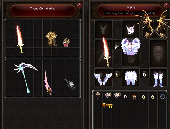 Bình thường mỗi nhân vật có một túi chứa đồ có diện tích 8x8 ô, tuy nhiên có thể túi nhân vật không đủ chỗ chứa những hành trang mà bạn mang theo, Rất có lợi khi bạn cắm Auto tự đánh, tự nhặt đồ mà nhân vật không thể nhặt được vì túi nhân vật đã Full nên BQT sẽ cung cấp thêm cho bạn 2 khoang chứa đồ nữa, mỗi khoang có diện tích 4x8 ô.